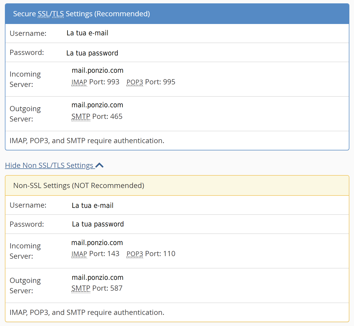 Di seguito puoi prendere visione dei parametri di configurazione con e senza SSL